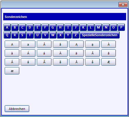 Alphabetisch sortiert, stehen Ihnen viele Sonderzeichen zur Verfügung.