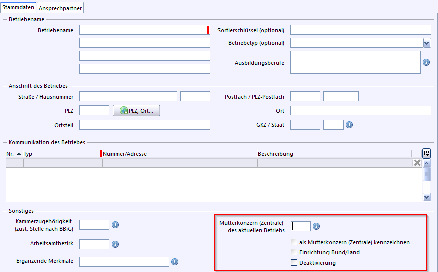 Haben Sie einen Betrieb mehrfach angelegt, weil viele Zweigstellen vorhanden sind, können Sie einen dieser angelegten Betriebe als Mutterkonzern kennzeichnen. Dazu aktivieren Sie das Kontrollfeld Aktuellen Betrieb als Mutterkonzern (Zentrale) kennzeichnen im Modul Betriebe auf dem Reiter Ansprechpartner.