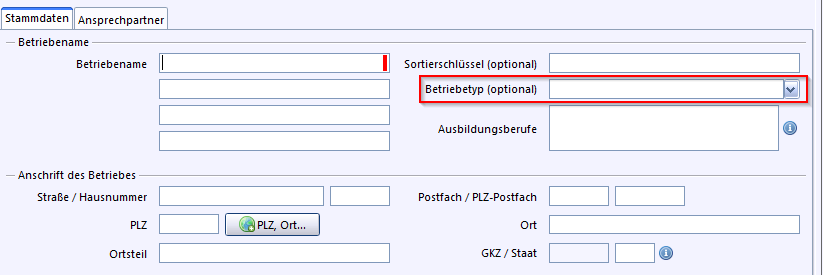 Die im Feld Betriebetyp hinterlegte Werteliste kann von der Schule selbst im Modul Wertelisten (Werteliste Betriebetyp) erweitert und gepflegt werden.