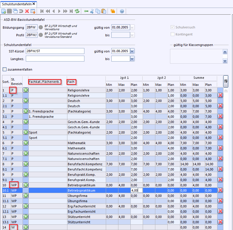 •Dieses Vorgehen wird immer dann nötig, wenn aktualisierte Basisstundentafeln für Ihre Schulart herausgegeben werden. •Wird ein Fach in einer Jahrgangsstufe nicht unterrichtet, lassen Sie das Feld für die Anzahl der Stunden leer, denn sobald ein Wert >= 0,0 eingetragen wird, gelangt das Fach in die Fächerwahl und u. U. in die Noteneinabe. |