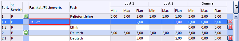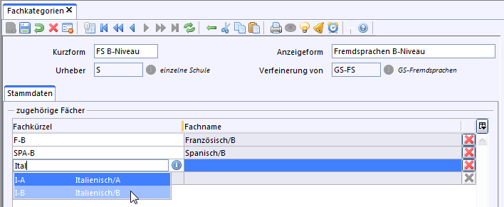Es wird zwischen Fächern und Fachkategorien unterschieden. Eine Fachkategorie wird verwendet, sobald der Schüler eine Wahlmöglichkeit zwischen mehreren Fächern hat (z. B. 1. Fremdsprache: Wahlmöglichkeit zwischen Englisch und Französisch).