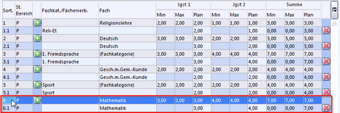 Dazu passen Sie die Auswahl der Fächer an und geben an, welches Fach in welcher Klassenstufe mit wievielen Stunden unterrichtet wird.