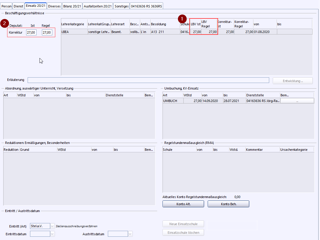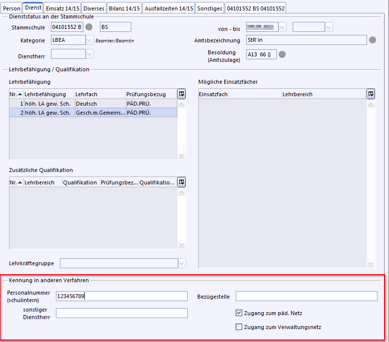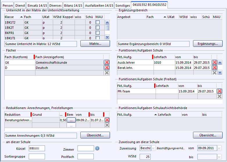 Auf dem Reiter mit dem Dienststellenschlüssel der Schule werden der Unterricht an der Schule, evtl. Aufgaben und Sonderfunktionen und die Reduktionen an dieser Schule hinterlegt.