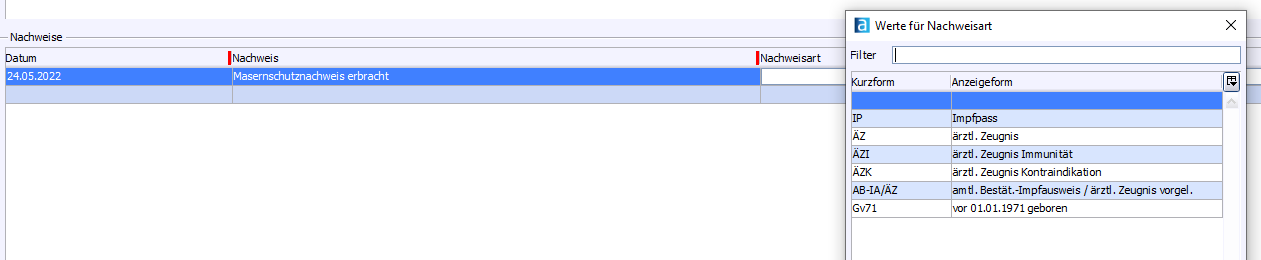 Im Abschnitt Nachweise kann der Impfnachweis der Masernschutzimpfung hinterlegt werden.