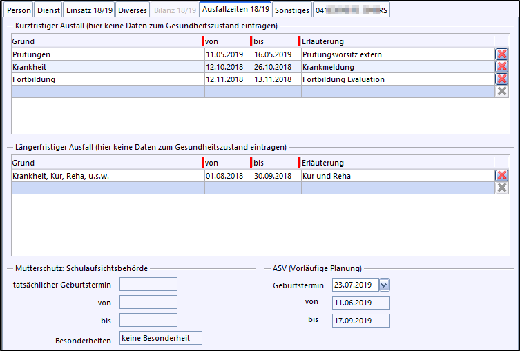 Unter diesem Reiter werden die Ausfallzeiten der Lehrkraft im aktuellen Schuljahr, getrennt nach kurzfristigem und längerfristigem Ausfall, erfasst bzw. angezeigt.