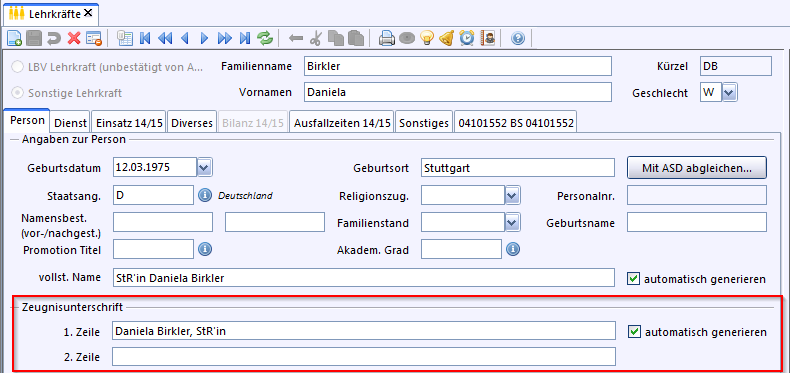 Auf dem Reiter Person ist es möglich eine ein- bzw. zweizeilige Zeugnisunterschrift zu hinterlegen. Wenn Sie die Checkbox automatisch generieren aktivieren, füllt ASV-BW die erste Zeile, mit den im Programm hinterlegten Daten, für Sie aus.