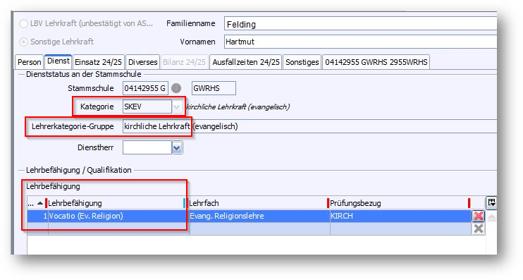 Im Modul Schulische Daten > Schulen, Reiter Statistik XX/YY, Reiter Religionsunterricht werden Lehrkräfte automatisch eingetragen, wenn sie folgende Eigenschaften haben (Lehrkräfte-Modul, Reiter Dienst):
