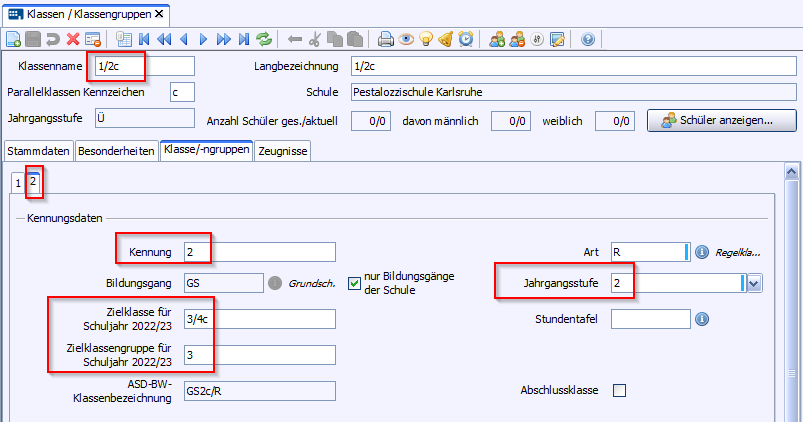 Eine neue Klassengruppe ist angelegt und bis auf die Kennung mit den bisherigen Daten vorbelegt.