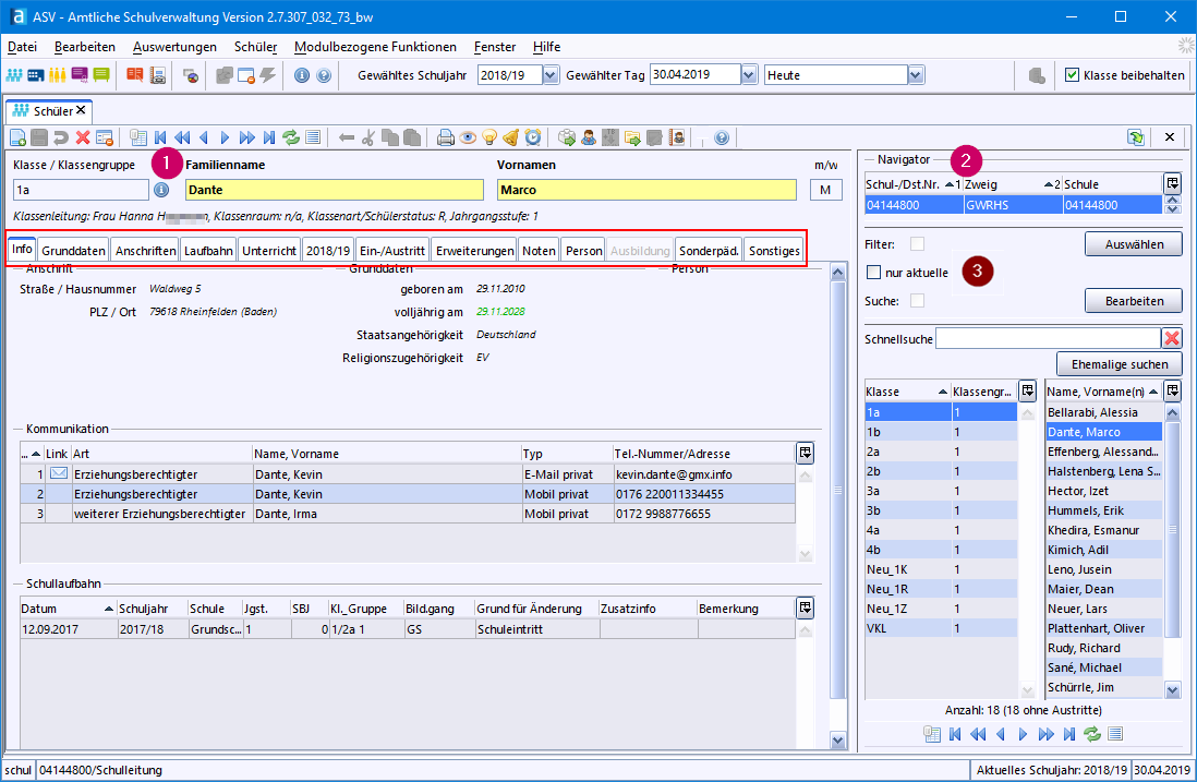 Das Schülermodul enthält die Schülerkarteikarte (1) und den Navigator (2), in dem Sie genau einen Schüler auswählen.
