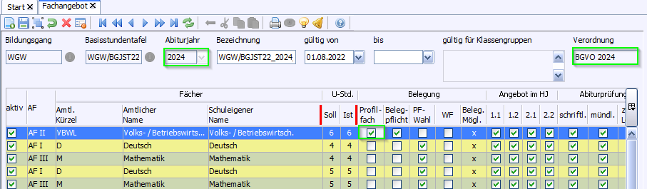 Das Fachangebot wird auf der Grundlage der ab Schuljahr 22/23 gültigen Fachangebote (BGJST22) für jeden Bildungsgang einzeln angelegt, da nur ein Fach als Profilfach markiert werden kann.