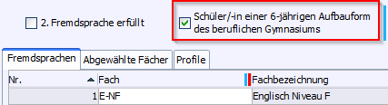 Tipp: Tragen Sie dort gleich bei Eintritt in den Bildungsgang nach E-NF ggf. an 2. Stelle die Fremdsprache ein, die laut BGVO die Voraussetzung für den Erwerb der Allgemeinen Hochschulreife erfüllt, z.B. Französisch oder Latein.
