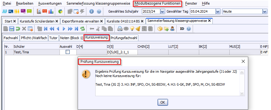 Tipp: Belegen Sie je nach Schülerwahl gleich zu Beginn der Jahrgangsstufe 1 das Fach als 2. Prüfungsfach und führen Sie erst anschließend über Modulbezogene Funktionen die Vorbelegung der Fachwahl aus.