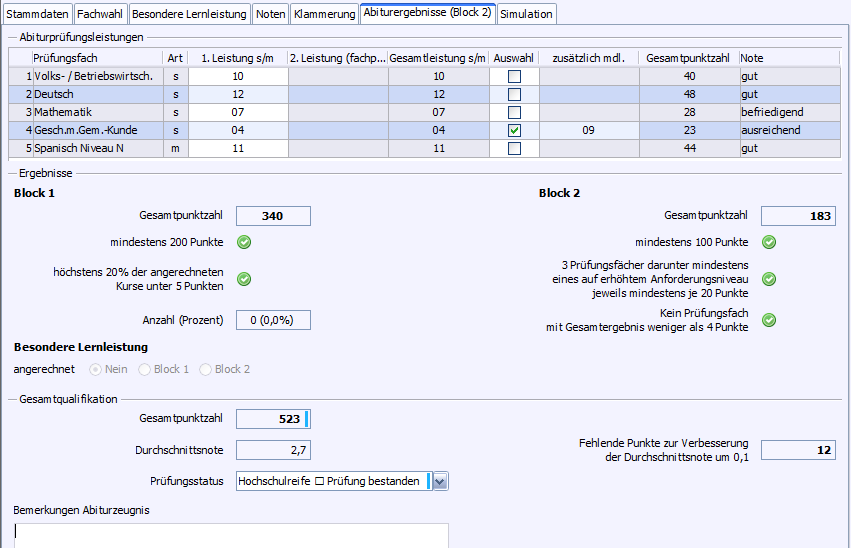 Datei: Kursstufe > Schülerdaten / Reiter: Abiturergebnisse (Block 2) Die Gesamtpunktzahl für Block 1 und die Durchschnittsnote auf dem Reiter Abiturergebnisse (Block 2) werden nur angezeigt, sofern auf dem Reiter davor die Klammerung durchgeführt wurde. Die Ergebnisse der schriftlichen Prüfungen können auch kursweise unter Datei: Kursstufe > Abiturprüfungsleistungen eingegeben werden, sofern Kurse eingerichtet wurden. Ist die Prüfung nur mündlich, wird das Ergebnis in die Zelle 1. Leistung s/m eingetragen. Um das Ergebnis einer zusätzlichen mündlichen Prüfung eingeben zu können, ist vorher der Haken bei Auswahl zu setzen. Das Ergebnis bei Gesamtleistung wird nur angezeigt, wenn das Feld 1. Leistung s/m gefüllt ist. Ab dem Abiturjahr 2024 ist im mündlichen Prüfungsfach bei 0 NP eine zusätzliche mündliche Prüfung vorgesehen: tragen Sie dann die 0 NP bei 1. Leistung s/m ein, haken Sie die Checkbox Auswahl an und geben Sie das Ergebnis der zusätzlichen mündlichen Prüfung ein. Die beiden Teile werden im Verhältnis 1:1 verrechnet, der ggf. ungerade Wert wird vervierfacht. Bitte beachten Sie, dass sowohl das Feld Bemerkungen wie auch der Platz dafür auf dem Zeugnis begrenzt sind. Wurden alle Voraussetzungen für die Allgemeine Hochschulreife erfüllt, ist der Prüfungsstatus auf "B" zu setzen, damit der Schnitt im Abiturzeugnis erscheint. Hinweis: Für den Export dieser Maske steht Ihnen in der Exportformatebibliothek das Format zz Prüfungsleistungen Abitur zur Verfügung. |