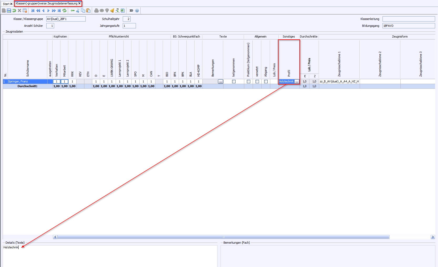 >Die Fächer (z. B. Lernfeldprojekte (LFP)), die auf der rechten Seite unterhalb der Beruflichen Kompetenz ausgegeben werden sollen, sind in der Spalt Art als Schwerpunkt zu kennzeichnen. In der Spalte Bezeichnung Zeugnis ist der Titel des Lernfeldprojekts (z. B. Gäste bewirten) einzutragen.