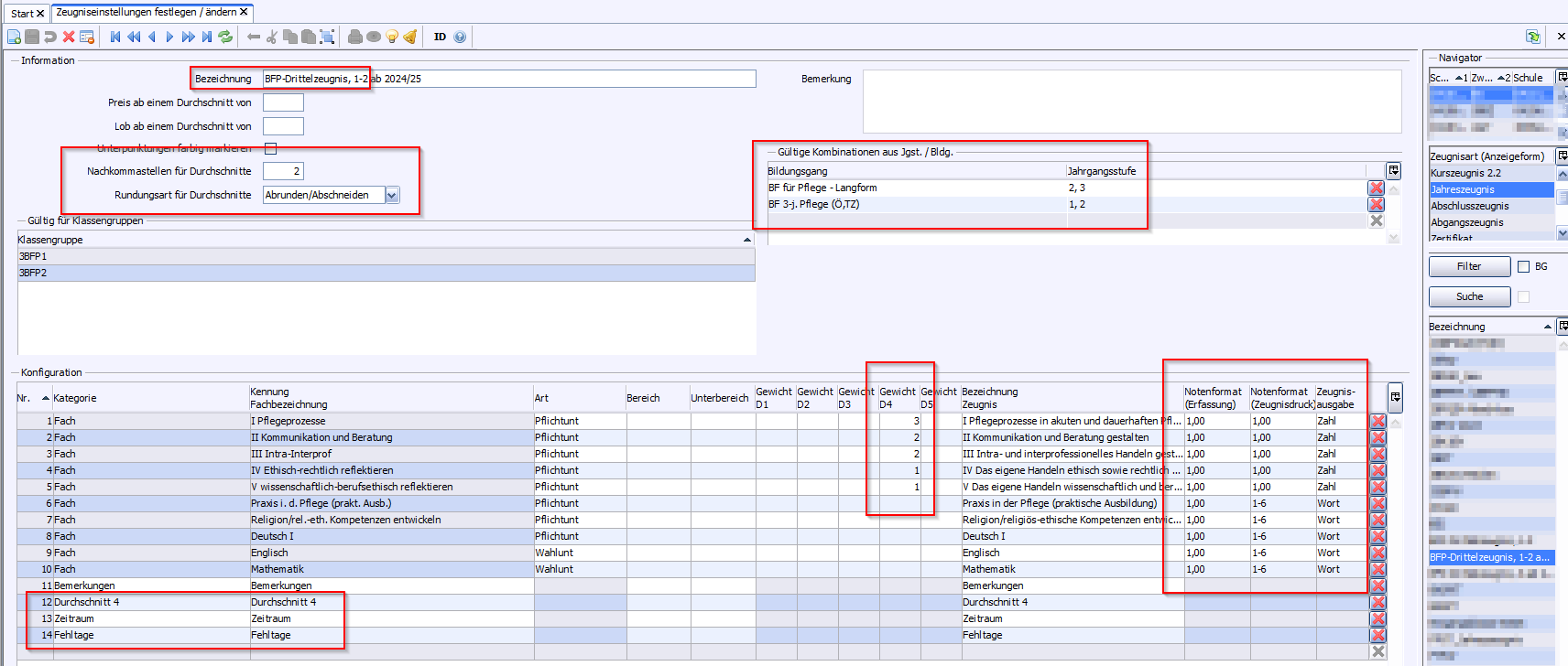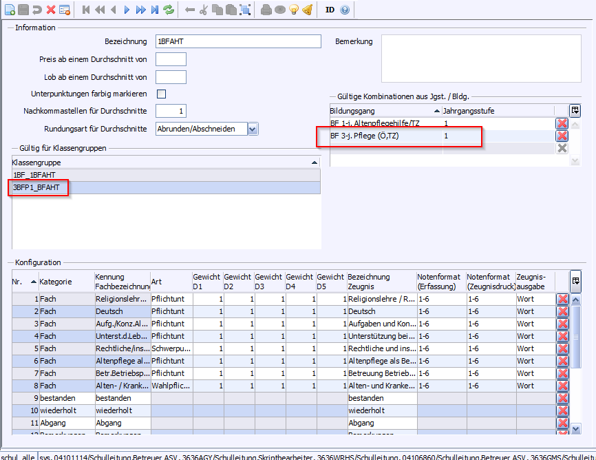Navigation: Zeugnisse > Zeugniskonfiguration > Berufliche Schulen > BFS - Berufsfachschule 3BFP/BFPL |