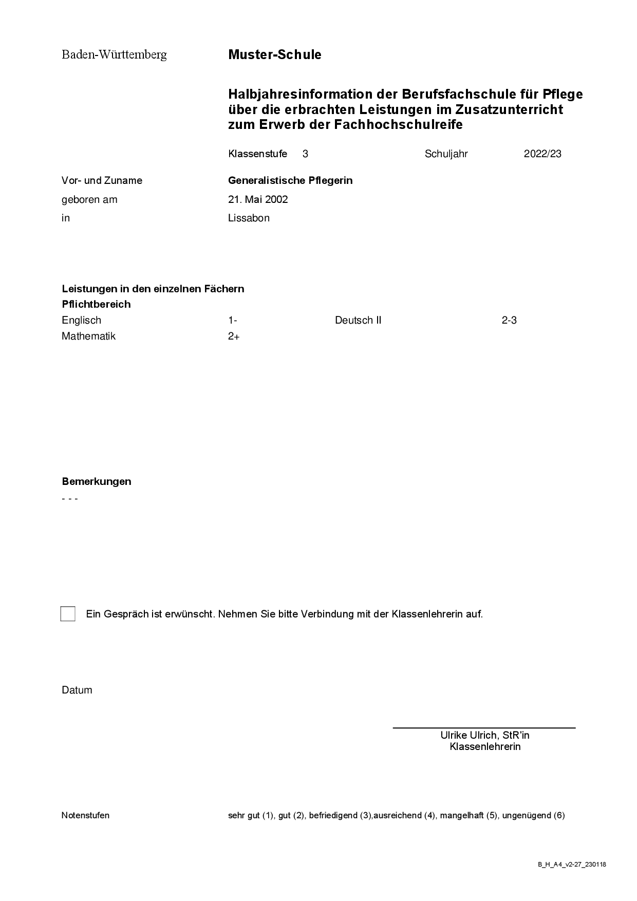 > Tragen Sie hier die Ergebnisse der Zwischenprüfung ein, sowie ggf. Bemerkungen. Als Zeugnisschablone wählen Sie bei beiden Bildungsgängen zz_B_3BFP_PR1_A4. |