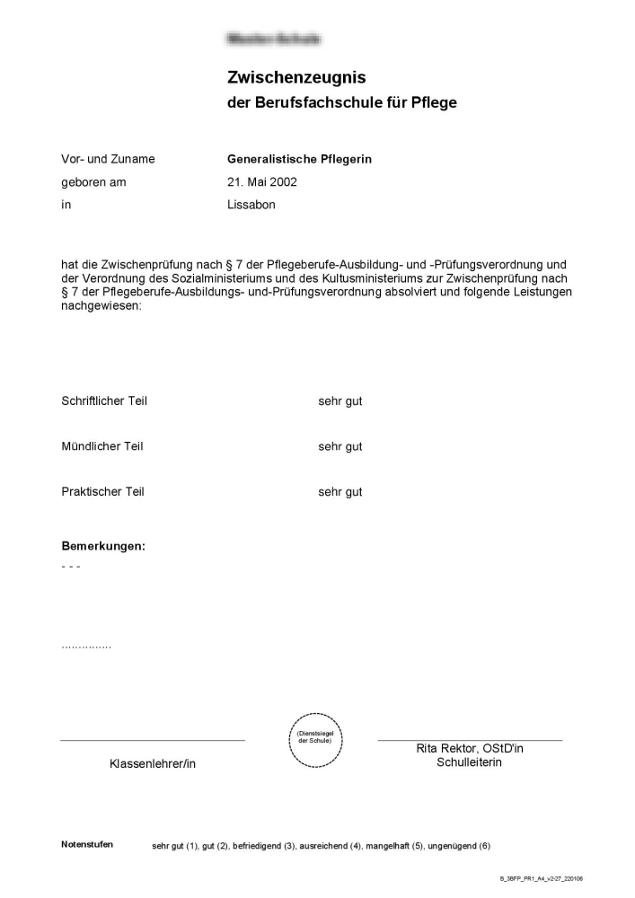 >Wählen Sie für das Zeugnis der Staatlichen Prüfung zz_B_BFP_A_A4_A_PR1. >Tragen Sie die Noten der schriftlichen, mündlichen und praktischen Prüfung ein. Die Gesamtnote wird anhand von Durchschnitt 3 errechnet. >Ausbildungsberuf: Standardmäßig wird als Ausbildungsberuf Pflegefachfrau / Pflegefachmann ausgegeben. Andere Ausbildungsberufe können über diese Kategorie erfasst werden: