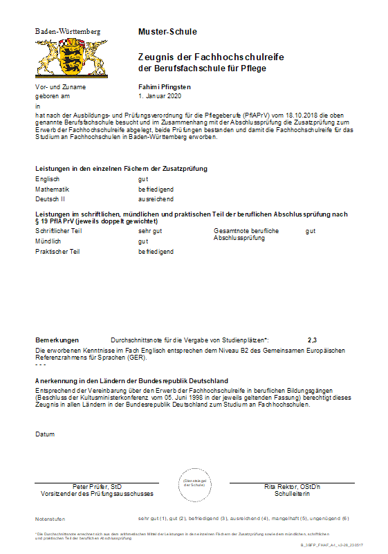 >Wählen Sie für das Zeugnis der Staatlichen Prüfung zz_B_3BFP_FHAF_A4. >Tragen Sie die Noten der schriftlichen, mündlichen und praktischen Prüfung, sowie für die Wahlfächer Englisch, Mathematik und Deutsch II ein. Die Gesamtnote wird anhand von Durchschnitt 3 errechnet. >Wählen Sie bestanden:
