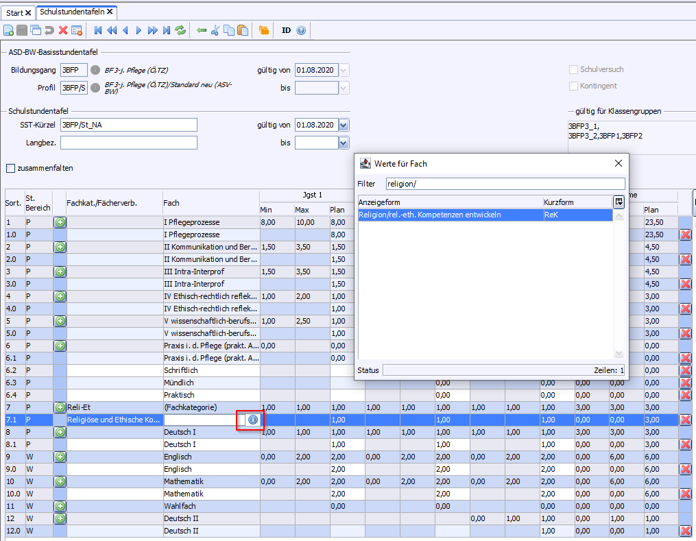 Damit das Fach ReK - Religion/rel.-eth. Kompetenzen entwickeln richtig als „Religionslehre sowie Religiöse und Ethische Kompetenzen entwickeln“ bzw. „Religiöse und Ethische Kompetenzen entwickeln“ korrekt auf dem Zeugnis ausgegeben wird, fügen Sie die Bezeichnung im Zeugnis für das Jahreszeugnis und die weitere Form ein. In der Schulstundentafel (3BFP bzw. BFPL) ersetzen Sie die Fachkategorie Reli-Et durch das Fach ReK. Hier Fach wählen, nicht Fachkategorie. |