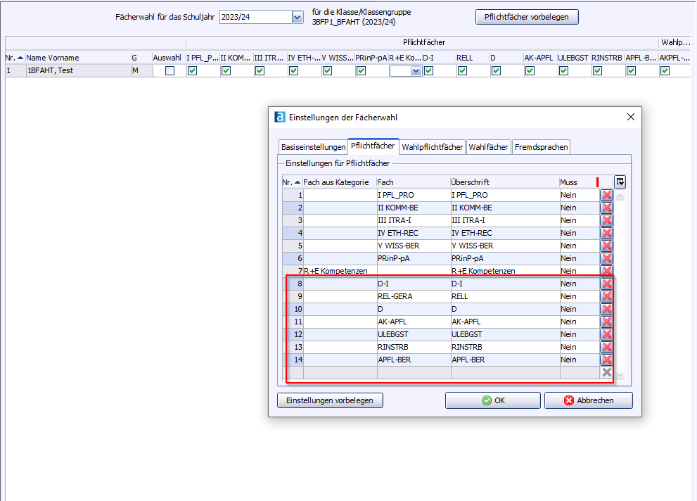 >Zeugnisart: Halbjahresinformation >Bildungsgänge: 3BFP, Jahrgangstufe 1, 2, 3 >Modulbezogene Funktion: Fächer aus Stundentafel übernehmen: >Entfernen Sie alle Fächer die nicht Teil des Zusatzprogramms zur Erlangung der Fachhochschulreife sind. >Ändern Sie Art der Fächer auf Pflichtunterricht. |