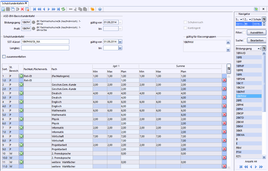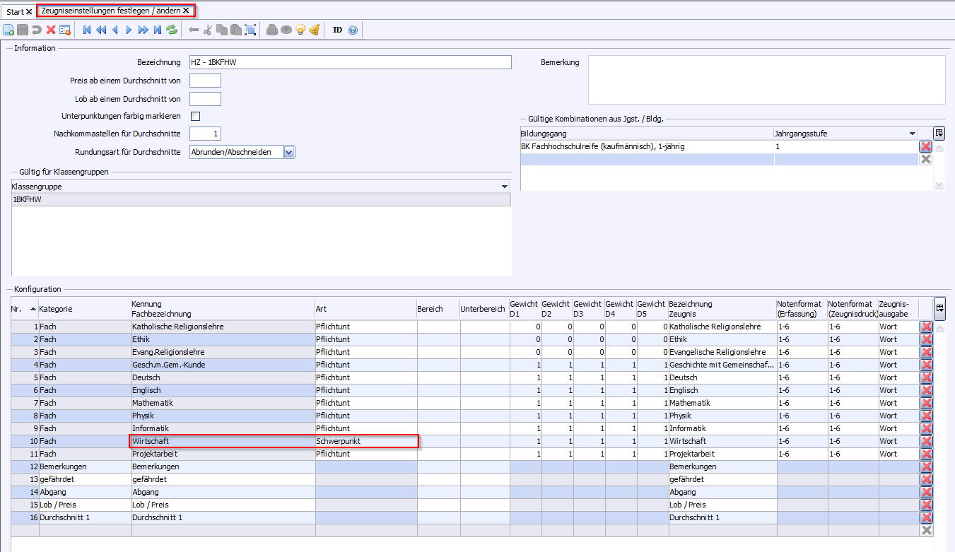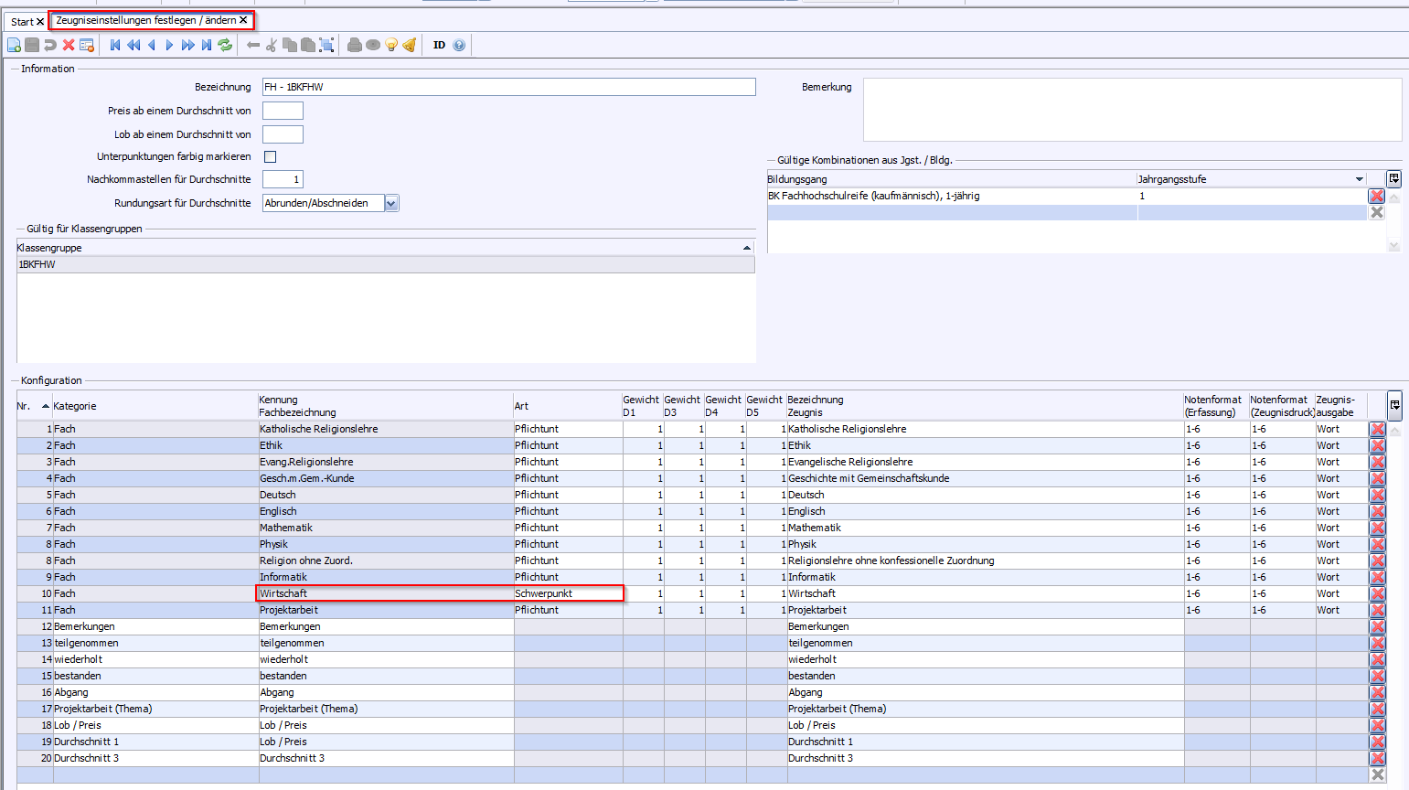 >Je nach Bildungsgang: Fachbezeichnung Wirtschaft(kaufm., im Beispiel unten) / Technische Physik (gew.) / Biologie mit Gesundheitslehre (hausw.) / Gestaltung (gestalterische Richtung) in der Spalte Art die Bezeichnung Schwerpunktauswählen.