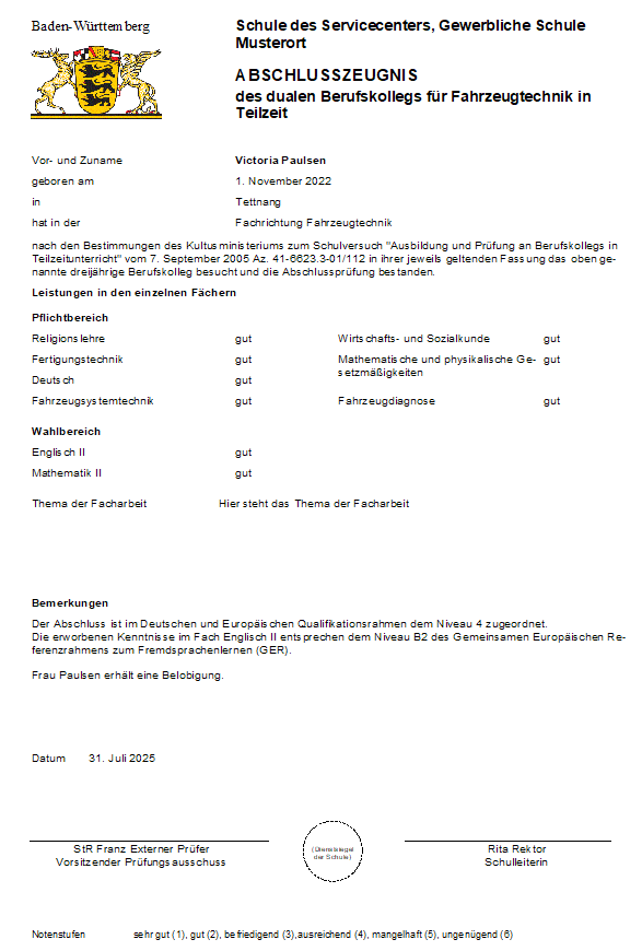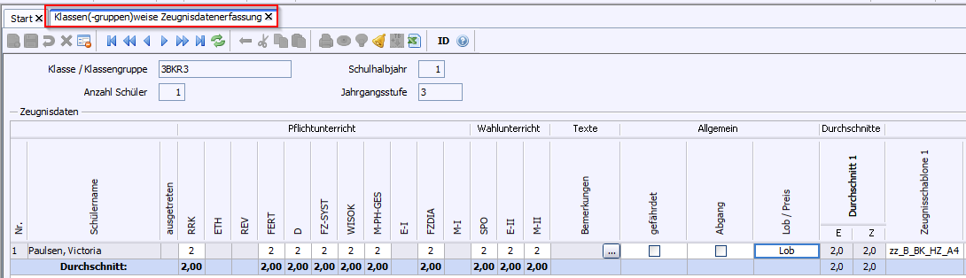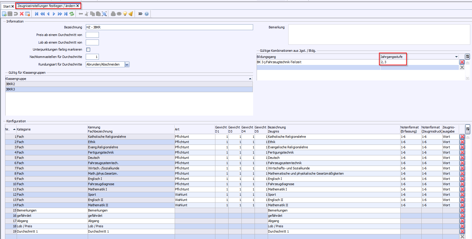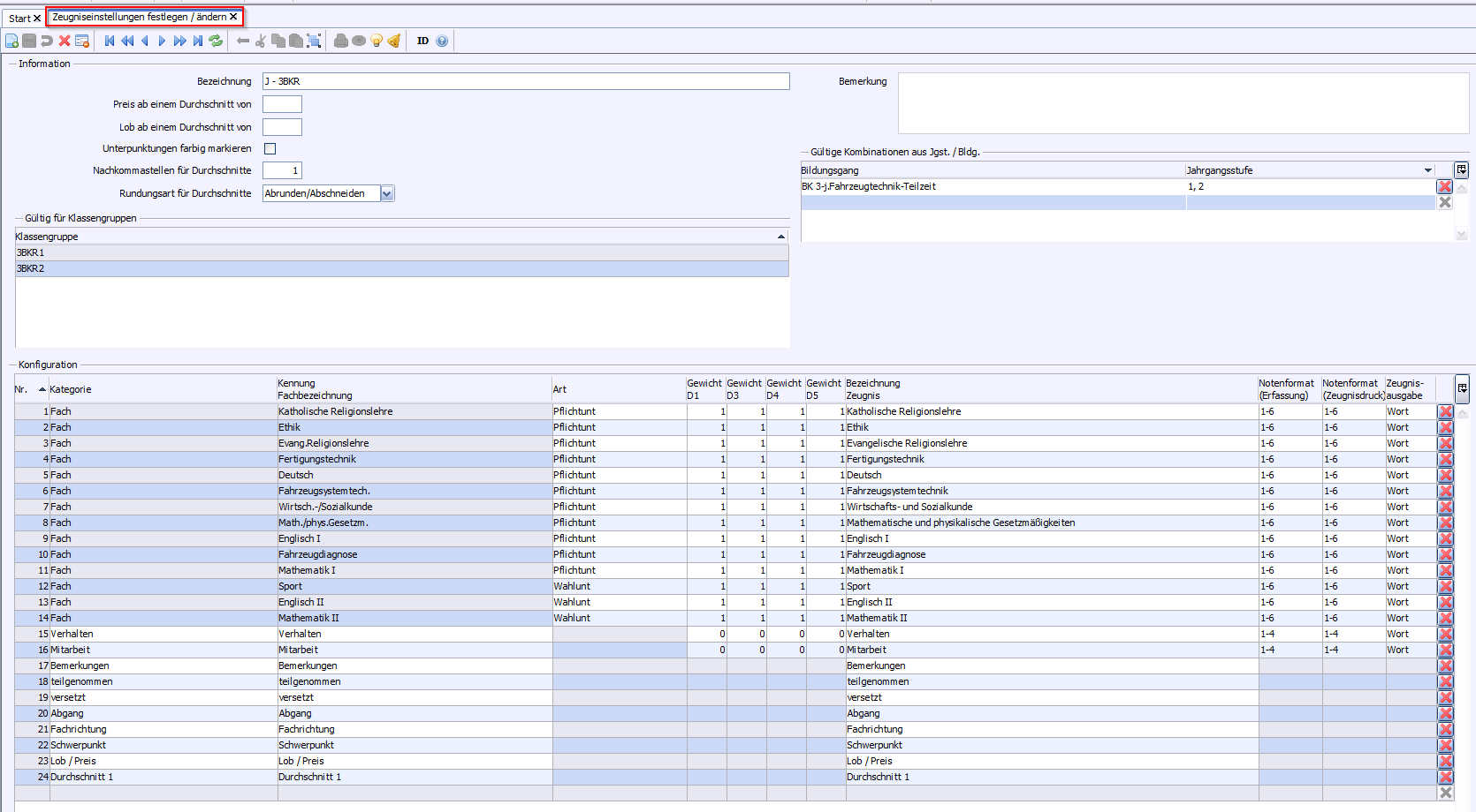 p Die unterschiedlichen Texte auf den Zeugnissen werden gemäß der in den Klassen zugewiesenen Stundentafeln erstellt. Siehe Voraussetzungen. Für die Erfassung von Einzelnoten bei zwei Abschlüssen (Assistent und Fachhochschulreife) können Sie die von uns bereitgestellten Notenblöcke verwenden. (Einstellungen Notenverwaltung) |