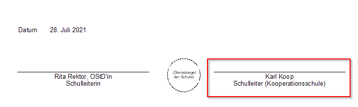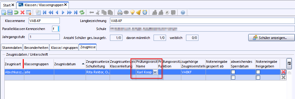 Der Schulleiter der Kooperationsschule wird wie ein externer Prüfer erfasst (Personal - von Anderen erteilt) und bei der Klasse als Prüfer eingetragen. Eine Funktion muss nicht erfasst werden.