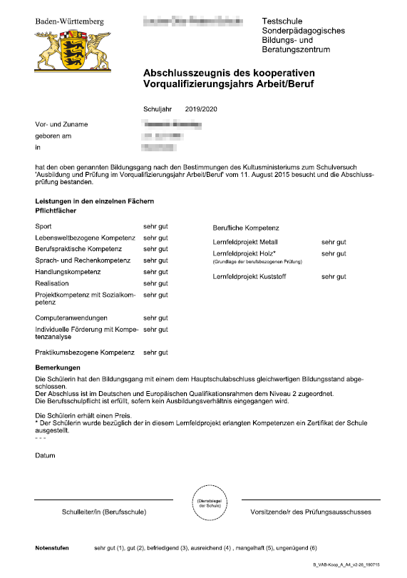 >Fügen Sie folgende Zusatzleistungen in die Zeugniskonfiguration ein: Bemerkungen, bestanden,wiederholt,erfolgreich,Lob / Preis, Durchschnitt 1,Projektprüfung (Thema), Praktikumsstelle