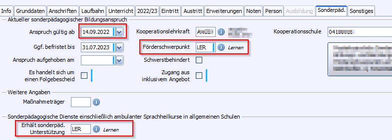 Um im Zeugnis die Bemerkung, dass Schüler zieldifferent unterrichtet wurden, zu erhalten, ist im Modul Schüler im Reiter Sonderpäd. im Feld Erhält sonderpädagogische Unterstützung die Art der Unterstützung auszuweisen. Dann wird die entsprechende Bemerkung im Zeugnis der allgemein bildenden Schule ausgegeben. |