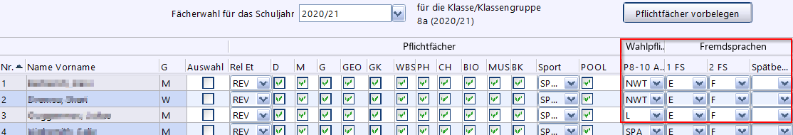 >Wenn im Schülermodul bereits 1. und 2. Fremdsprache gewählt wurden, werden diese in der Fächerwahl übernommen. Benutzen Sie dazu den Button Pflichtfächer vorbelegen. Auch das Profilfach, das in der Laufbahn eingetragen wird, wird in der Fächerwahl übernommen.