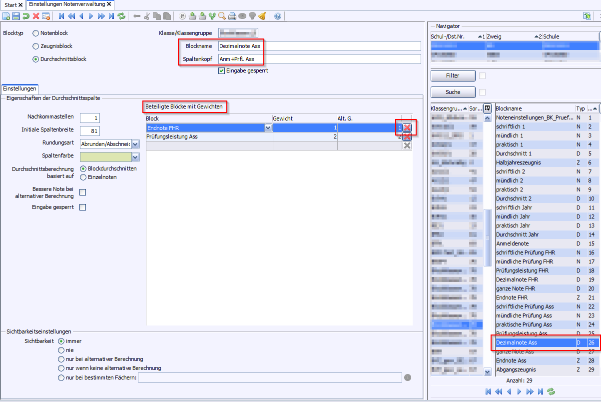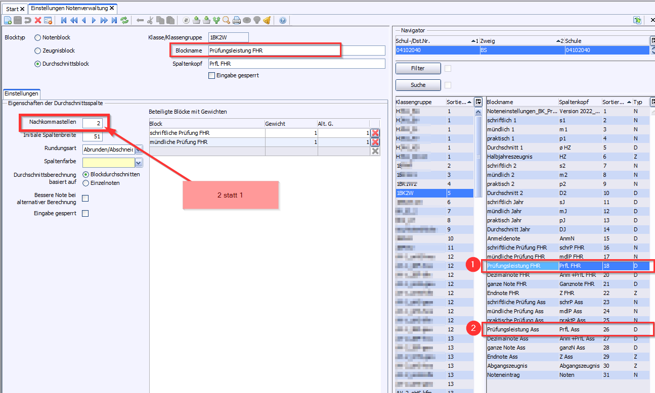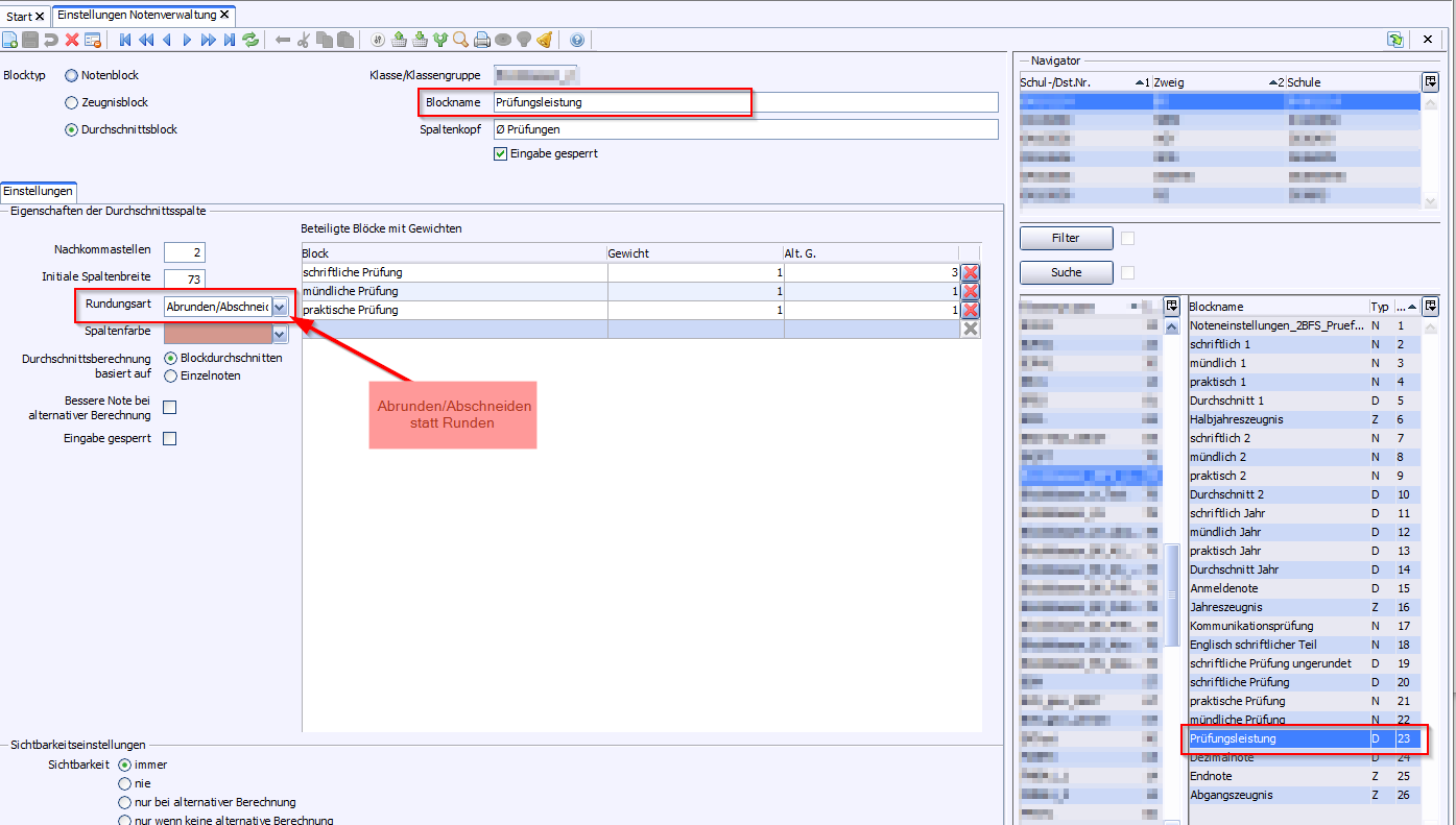 7 (In Schuljahr 2021/22) Ab Version vom 22.02.2022: Durchschnittsblöcke Dezimalnote und Prüfungsleistung, Eigenschaften der Durchschnittsspalte > Rundungsart auf Abrunden korrigiert.