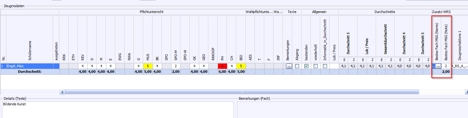 Wenn für das Bestehen der Abschlussprüfung von den Fächern Musik, Sport und Bildende Kunst nur das mit der besten Note berücksichtigt werden soll (und nur dann), sind die Zusatzkategorien Bestes Fach (Name) und Bestes Fach (Note) mit dem Fachnamen und der entsprechenden Note zu befüllen. Die Durchschnittsberechnung berücksichtigt dann nur die Note, die in Bestes Fach (Note) eingetragen ist, nicht die Noten in den Fächern Sport, Musik oder Bildende Kunst. Es wird automatisch ein entsprechender Vermerk in den Bemerkungen ausgegeben.