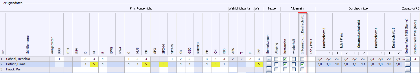 Soll die Note im Wahlfach Informatik auf Wunsch des Schülers berücksichtigt werden, so ist die Zusatzkategorie Informatik_in_Durchschnitt anzuhaken.