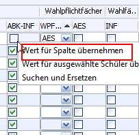 Falls nach erfolgter Fächerwahl noch eine Änderung vorgenommen werden muss, können einzelne Fachspalten gelöscht und, falls gewünscht, durch andere Fachspalten ersetzt werden. Das kann zum Beispiel dann sinnvoll sein, wenn die Wahlpflichtfächer/Profile bereits erfasst wurden und dann auffällt, dass in der Stundentafel fälschlich Stunden in einem Fach für die betreffende Klassenstufe eingetragen wurden. In der Fächerwahl muss dann zunächst bei allen Schülern das gewählte Fach abgewählt werden. Ist das Fach bei allen Schülern abgewählt, kann über Modulbezogene Funktionen > Einstellungen Fächerwahl die Fachspalte entfernt und bei Bedarf durch ein anderes Fach oder eine andere Fachkategorie ersetzt werden: |