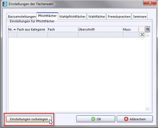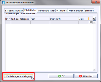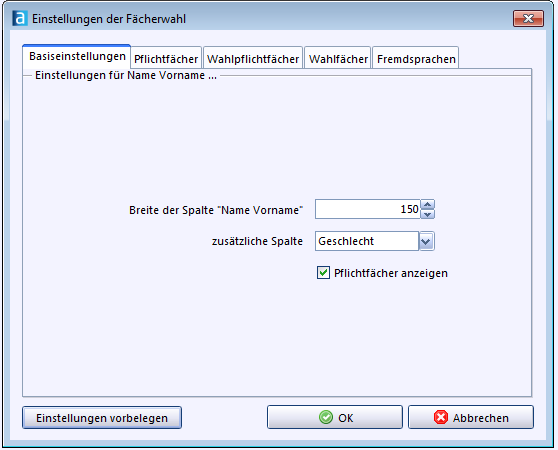 Fächerwahl) können auf Grundlage der Stundentafel, die im Modul Klassen auf dem Reiter Klassengruppe hinterlegt ist, den Schülern die Fächer zugewiesen werden, die sie belegen werden.