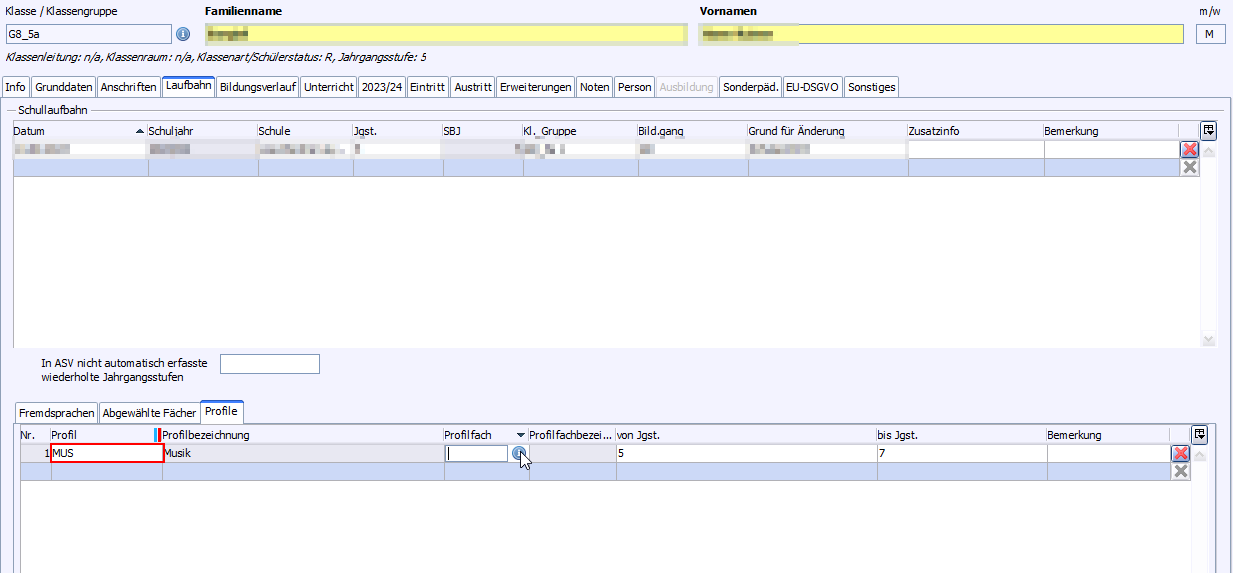 Die Profile an Gemeinschaftsschulen und Gymnasien finden sich sowohl in der Fächerwahl als auch unter Laufbahn > Profile. Im Schülermodul wird im Reiter Laufbahn unter Profil ein Profil eingetragen und das dazugehörige Fach in der Spalte Profilfach eingetragen. Dieses Fach wird automatisch in die Fächerwahl übertragen. Umgekehrt wird der Eintrag eines Profilfachs in der Fächerwahl ins Schülermodul übertragen.