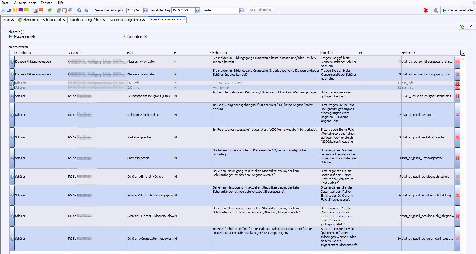 Im Screenshot sind drei verschiedene Reiter mit Plausibilisierungsfehlern für drei verschiedene Schulzweige zu sehen. Erst wenn diese behoben wurden, startet die ESS-Anwendung.