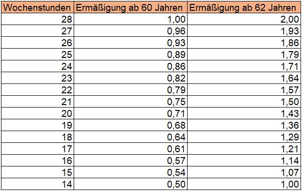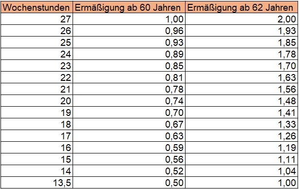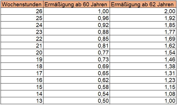 Ab dem Schuljahr, in dem sie 62 Jahre alt werden, erhalten sie eine weitere Deputatsstunde ermäßigt. Teilzeitbeschäftigte erhalten entsprechend ihres Deputatsumfangs anteilig ihre Stundenreduktionen.