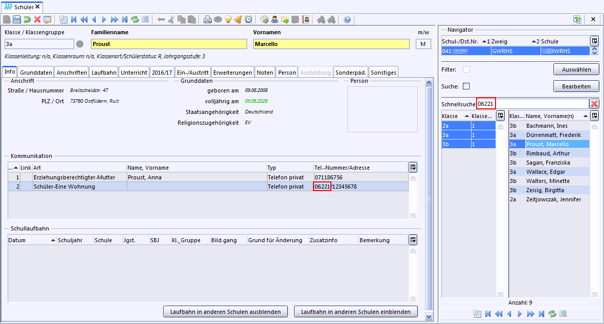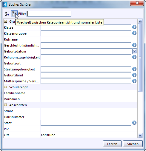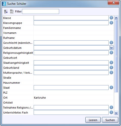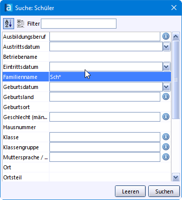 Je nach Datenbereich werden dazu unterschiedliche Datenfelder angeboten. Sie können sich z. B. alle Schüler heraussuchen lassen, die in einem bestimmten Ortsteil wohnen.