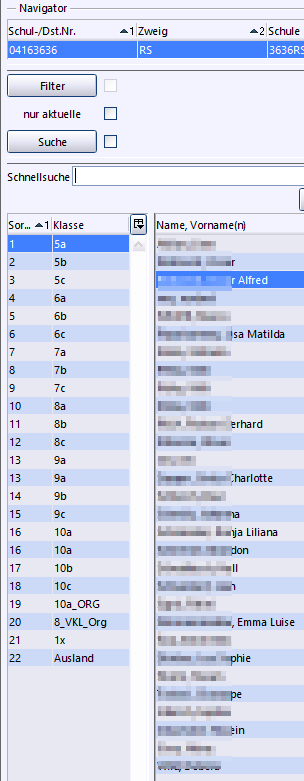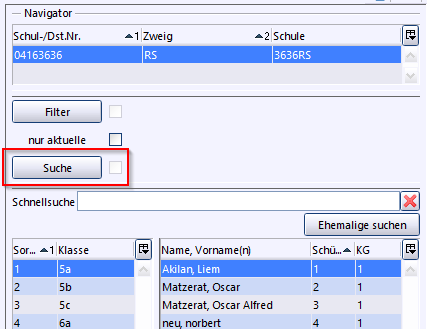 Das Suchergebnis zeigt im Beispiel nun 17 Schüler an. Durch den Haken in der Checkbox bei Suche wissen Sie, dass derzeit eine Suchauswahl angezeigt wird. Wird der Haken entfernt, ist die Suche nicht mehr aktiv und es werden wieder alle Schüler der Klasse angezeigt.
