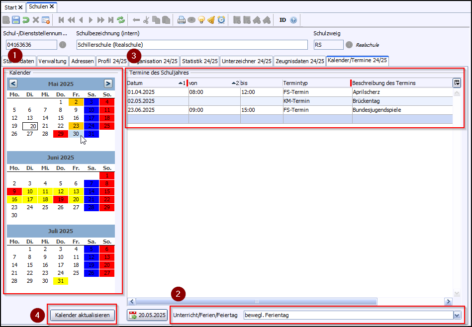 - Die Schaltfläche Kalender aktualisieren (4) dient dazu, schulspezifische Einträge im Kalender (1) bequem zu löschen.