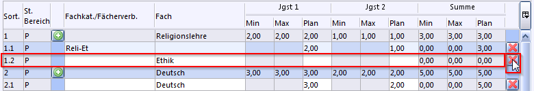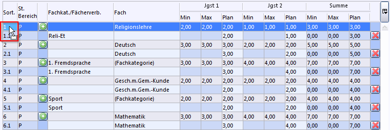 •Dieses Vorgehen wird immer dann nötig, wenn aktualisierte Basisstundentafeln für Ihre Schulart herausgegeben werden. •Wird ein Fach in einer Jahrgangsstufe nicht unterrichtet, lassen Sie das Feld für die Anzahl der Stunden leer, denn sobald ein Wert >= 0,0 eingetragen wird, gelangt das Fach in die Fächerwahl und u. U. in die Noteneinabe. |