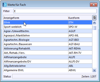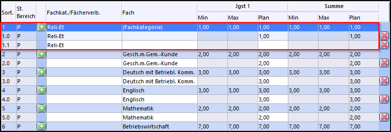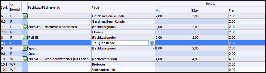 Es wird zwischen Fächern und Fachkategorien unterschieden. Eine Fachkategorie wird verwendet, sobald der Schüler eine Wahlmöglichkeit zwischen mehreren Fächern hat (z. B. 1. Fremdsprache: Wahlmöglichkeit zwischen Englisch und Französisch).