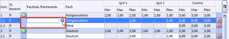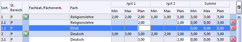 Dazu passen Sie die Auswahl der Fächer an und geben an, welches Fach in welcher Klassenstufe mit wievielen Stunden unterrichtet wird.