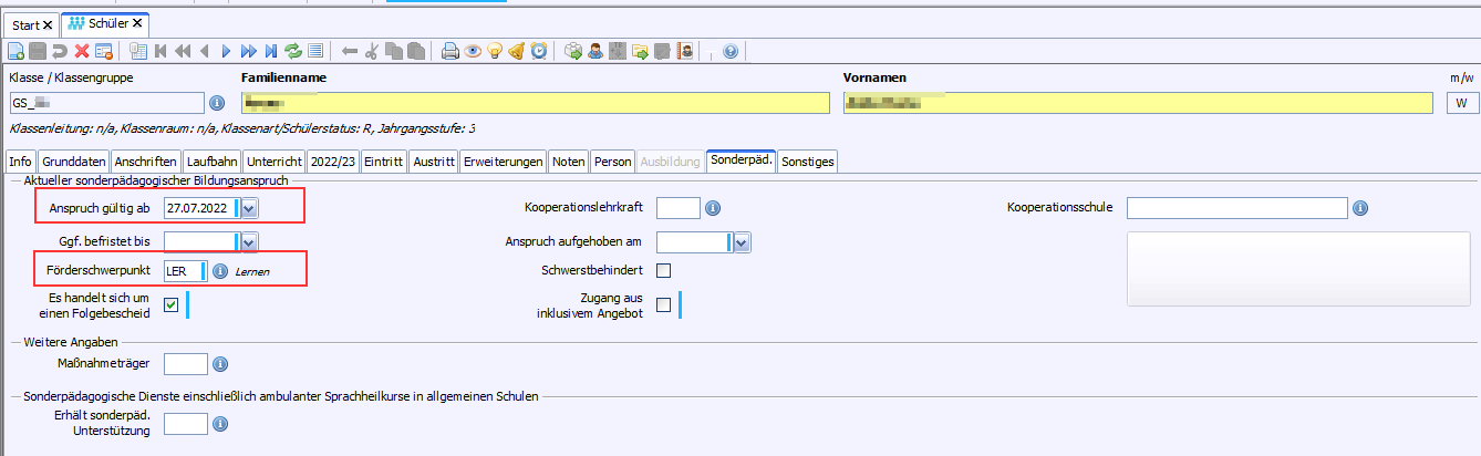 Nur im Reiter Sonderpäd. muss der sonderpädagogische Bildungsanspruch und der Förderschwerpunkt eingetragen werden.