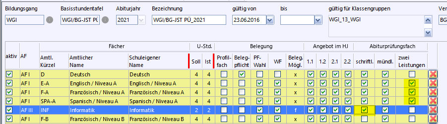 Einige Fächer (z. B. moderne Fremdsprachen oder Sport) sehen entweder bei der schriftlichen oder mündlichen Abiturprüfung eine zweite Leistung vor, für die eine eigene Note erteilt wird. Die Erfassung der fachpraktischen Note war bisher schon möglich, sofern im entsprechenden Fachangebot ein Häkchen in der letzten Spalte fachprakt. gesetzt war. Diese Spalte wurde in der Version 2.13 umbenannt in Zwei Leistungen, die Markierung blieb erhalten. Weitere Anpassungen sind hier nicht erforderlich.