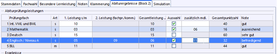 Erst dadurch öffnet sich in der Maske Abiturprüfungsleistungen des jeweiligen Kurses oder auf dem Reiter Abiturergebnisse (Block 2) das Feld zur Eingabe und wird entsprechend der Vorgaben zum Gesamtergebnis des schriftlichen Teils verrechnet und im Abiturzeugnis in der Spalte schriftlich ausgewiesen.