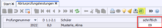 Datei: Kursstufe > Sammelerfassung klassengruppenweise / Reiter: Kurszuweisung Rufen Sie vorher in der Sammelerfassung klassengruppenweise auf dem Reiter Kurszuweisung über modulbezogene Funktionen das Skript Kurszuweisung prüfen auf und weisen Sie fehlende Schülerinnen und Schüler den Kursen der schriftlichen Prüfung zu, damit die Listen vollständig sind. Datei: Kursstufe > Abiturprüfungsleistungen Datei: Verwaltung > Exportformatebibliothek Leistungen können auf dem Reiter Abiturprüfungsleistungen nur für in 2.1 oder für 2.2 eingerichtete Kurse erfasst werden, sofern die Wochenstunden des Fachs mit den Wochenstunden des belegten Kurses übereinstimmen und das Fach schriftlich gewählt wurde. Die Tabelle ist über die Werkzeugleiste nach Excel exportierbar. Benennen Sie sie nach LK/Stunden/Kurs, da diese Daten nicht exportiert werden bzw. nach einer offiziell vorgegebenen Bezeichnung, um die Liste weiterverarbeiten zu können. Alternativ kann das Exportformat zz Kursstufendaten mit allen relevanten Daten (Schulchiffre, Schülerdaten, Kursdaten, Lehrkräftedaten) genutzt werden. |