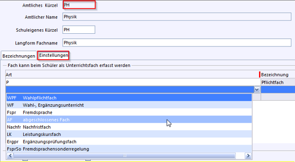 Da das Kurszeugnis nur über das Fachangebot und die Belegung des fünfstündigen Faches Deutsch oder Mathematik gesteuert wird, wirkt es sich nicht mehr auf das Kurszeugnis aus, ob ein Eintrag bei Pflicht-/Wahlfach gesetzt wurde oder nicht; allerdings können nur solche Fächer unter Schüler >Schülerdaten auf dem Reiter Unterricht gesehen werden, die hier mit "P" oder "W" gekennzeichnet sind. Das Kennzeichen "K" kann für die beiden Pflichtfächer auf erhöhtem Anforderungsniveau verwendet werden.