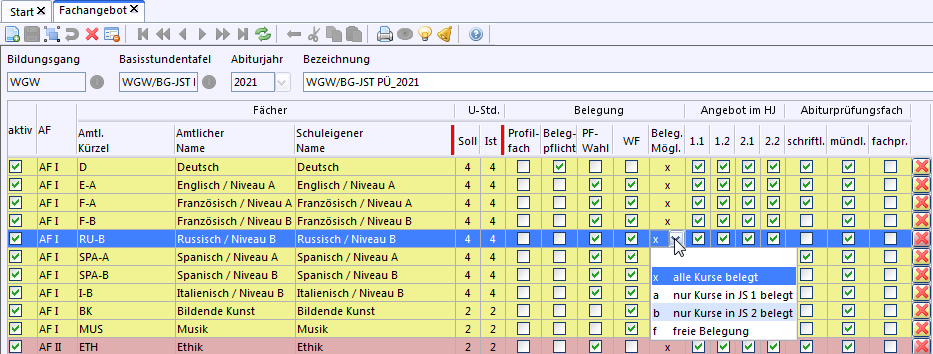s Rot unterlegte Fachangebote haben ein Ablaufdatum und werden beim Schuljahreswechsel ggf. ungültig. Sie können daher für die J1 nicht verwendet werden, da sonst Fachwahl und Noten im darauf folgenden Schuljahr nicht mehr vorhanden sind. Oben rechts wird die Gültigkeitsdauer des Fachangebots von...bis angezeigt. p AGY: Achten Sie bei der Auswahl der Basisstundentafel darauf, dass es sich nicht um eine Kontingentstundentafel handelt. BGY: Die Basisstundentafeln der Jahrgangsstufen sind grundsätzlich profilübergreifend konzipiert, also jeweils eine für SG, TG und WG mit allen Fächern. Für jedes Profil ist daher ein eigenes Fachangebot zu erstellen, da in der Spalte Profilfach nur ein Fach angehakt werden kann. Das Fachangebot für den sechsjährigen Bildungsgang kann für den entsprechenden dreijährigen Bildungsgang durch Kopieren erzeugt werden bzw. umgekehrt. |